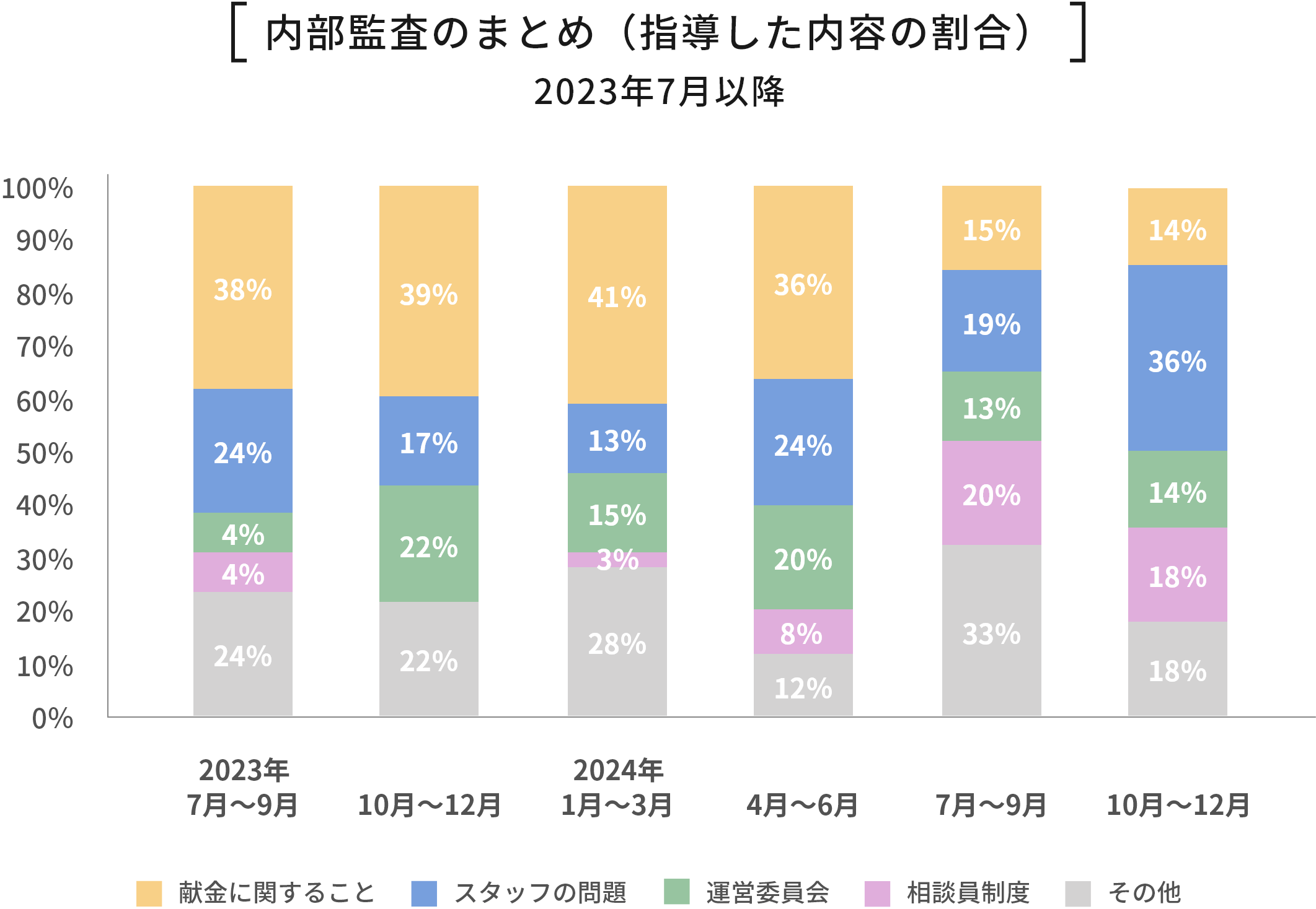下図は、内部監査後に指導した内容別の割合の推移である。これを見ると、「献金に関すること」(黄色)の指導割合が徐々に減少していることが分かります。