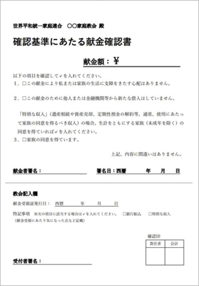 当法人は2023年2月より「献金を受領する際のガイドライン」を制定し、10万円以上の献金を受領する場合はその都度「献金確認書」に基づき、所定の内容を確認してから受領するという制度を導入しました。