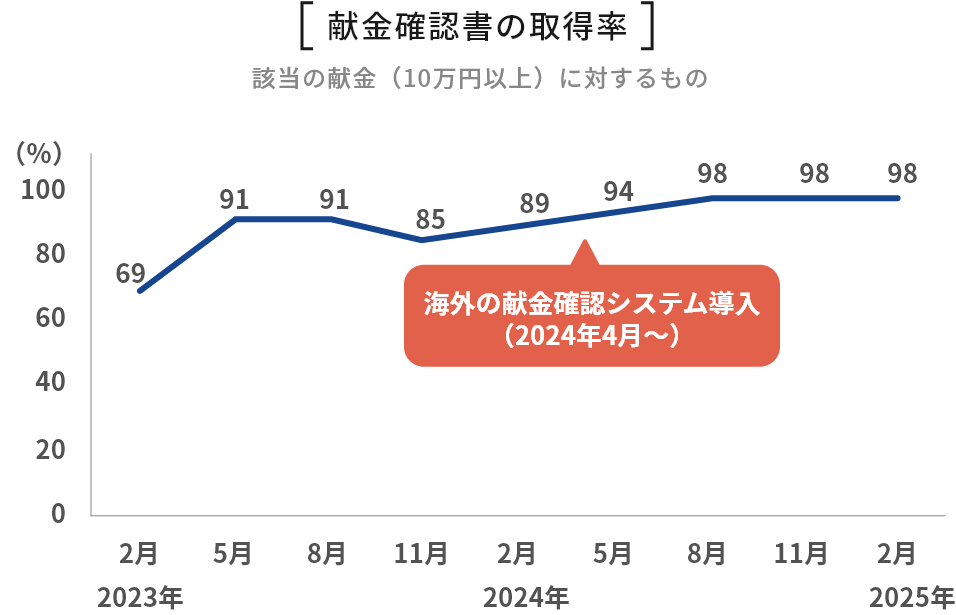また、2024年4月には、海外での献金についても同様に確認を行うシステムを導入しました。